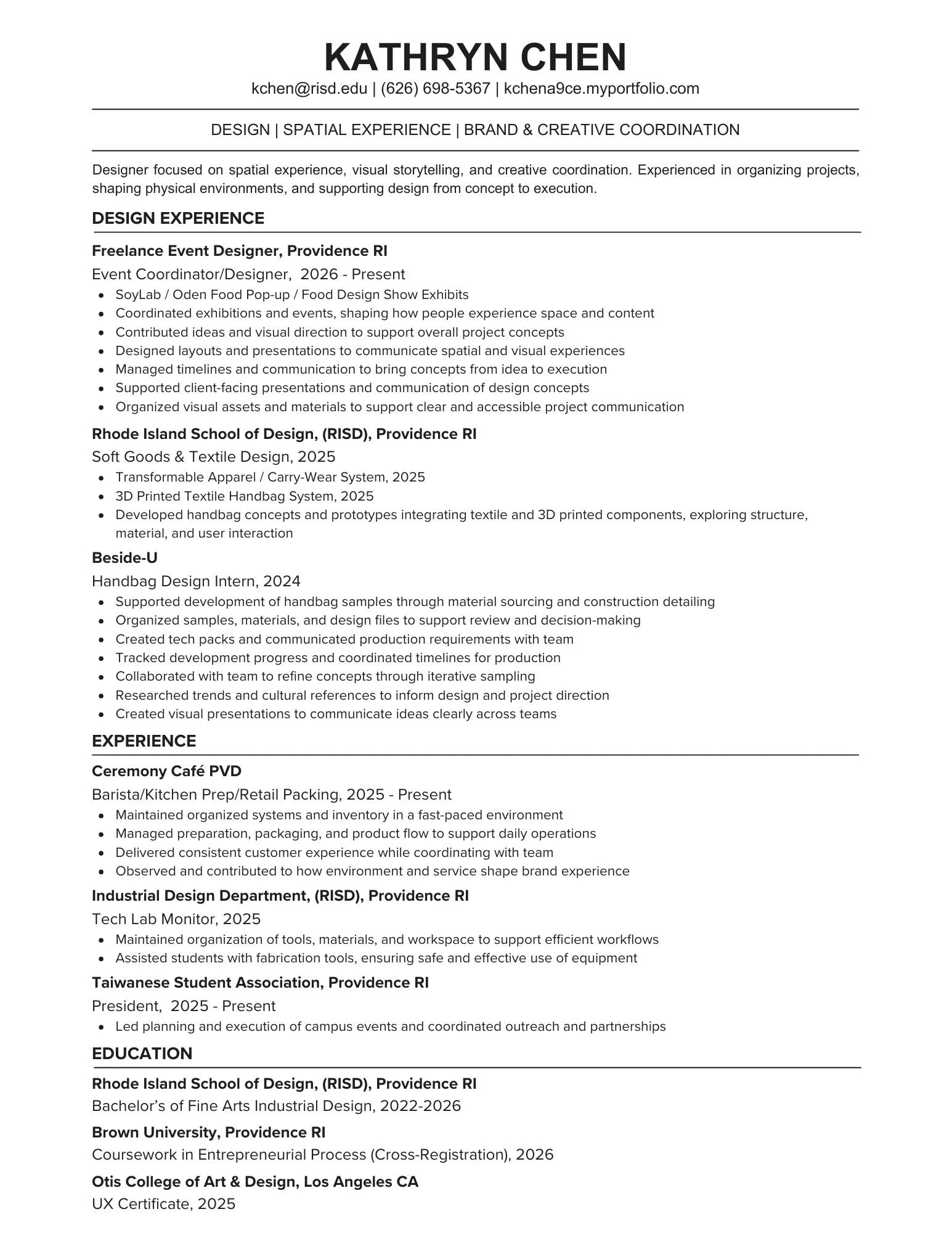 Hi, Iām Kathryn, senior studying Industrial Design at RISD interested in how design, people, and real-world experiences connect. With a background in accessories and hands-on work in retail and events, I enjoy helping ideas move from concept into something tangible through coordination, collaboration, and thoughtful execution.
